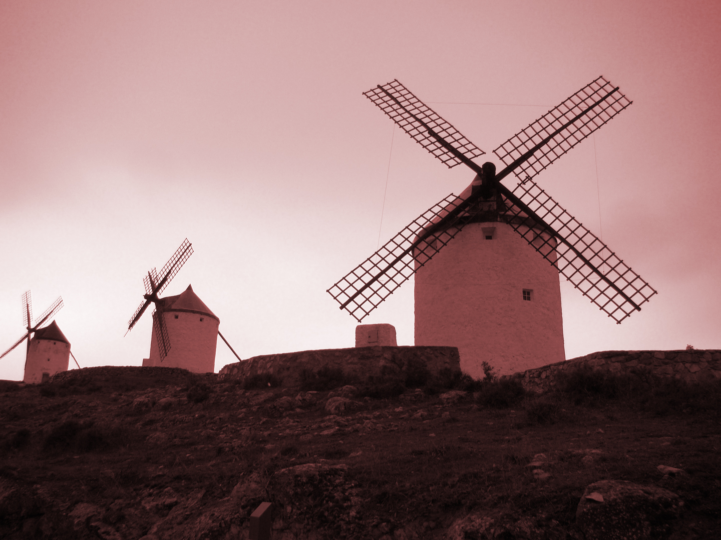muy pensativo cerca de Puerto Lápice, vigilante de sus desaforados molinos, que